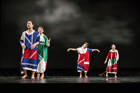 最前線にしゃべらない人がいて、後方に台詞を言う人がいるという関係性で言葉を聞く。そういう仕組みだから、『トカトントンと』みたいに、お客さんの前までノコノコと来て話すことができない構造なのかも。